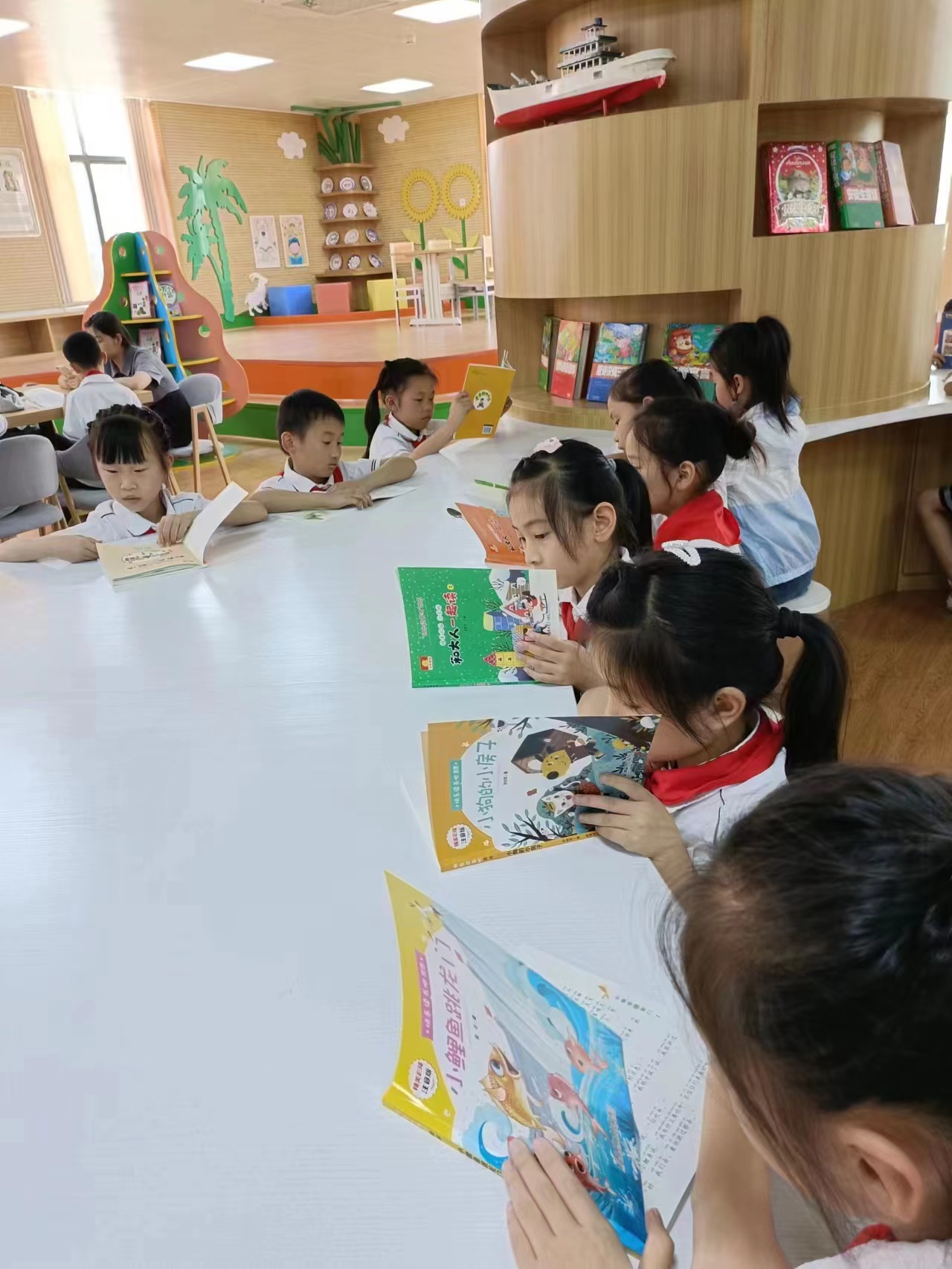 下图为济南市莱芜第二实验小学,孩子们拿着收到的图书,正聚精会神的阅读.