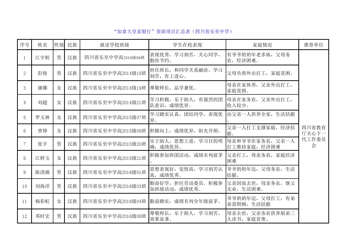 加拿大皇家银行资助项目汇总表(四川省乐至中学)